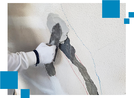 コンクリートのひび割れや鉄筋の劣化、タイルの浮きなど、外壁の欠損箇所を丁寧に補修いたします。補修の仕上がりはその後の防水工事や塗装工事にも影響するため、細かな施工が不可欠です。