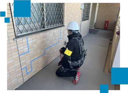 ひび割れや外壁の浮き、タイルのズレなど、建物の状態を丁寧に調査いたします。外壁の状態を正確に把握することは、その後の補修工事や防水工事の品質にも関わるため、細部までしっかり確認することが重要です。